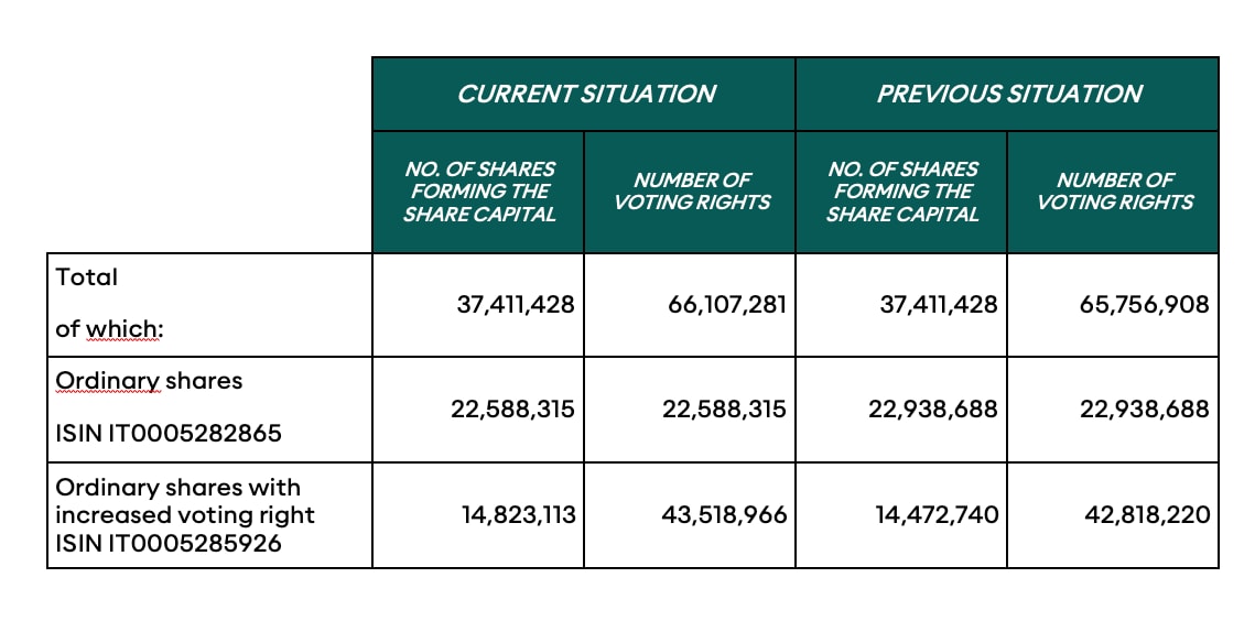 The following table shows the figures relating to outstanding shares and the number of voting rights that may be exercised.