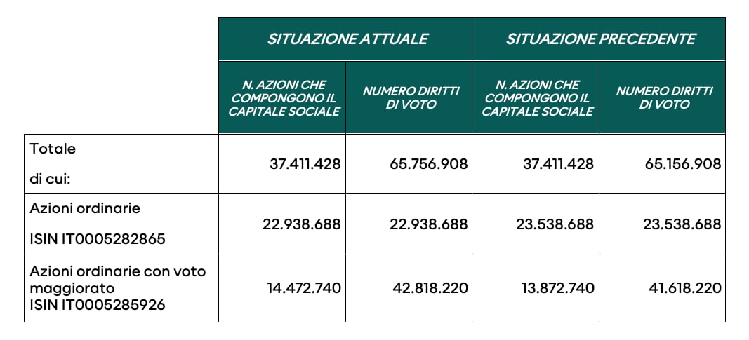 Nella seguente tabella sono riportati i dati relativi alle azioni in circolazione e al numero di diritti di voto esercitabili.