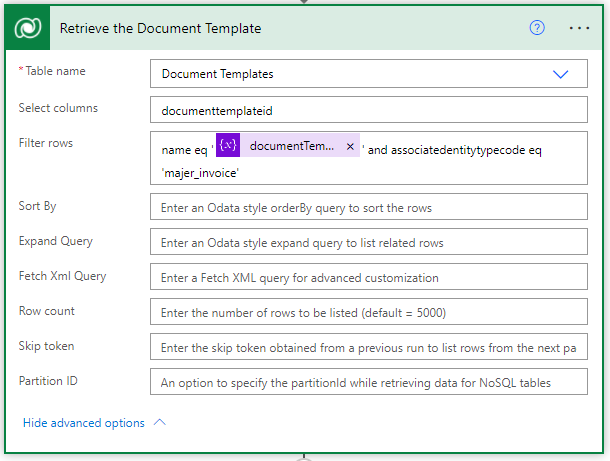 Next we need to grab the ObjectTypeCode so that when we deploy this Power Automate to other environments, we’re not hardcoding this value. Unfortunately, when you push a custom table from environment to environment, the ObjectTypeCode does not remain the same. Therefore, we cannot assume our custom majer_invoice entity will have the same code in Dev versus Test versus Prod.