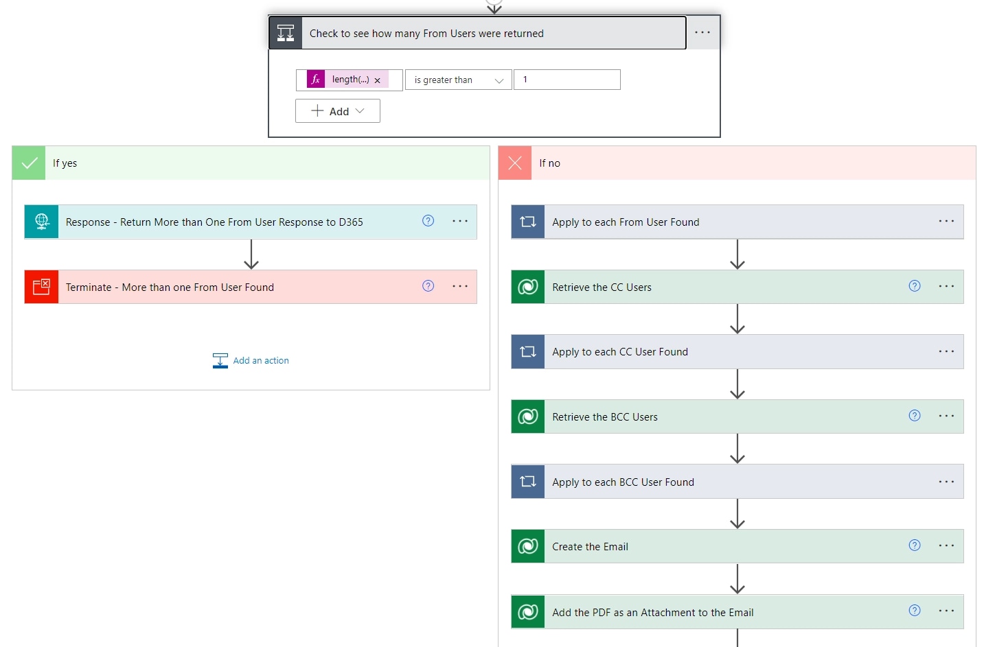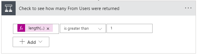 Next, a check is performed to ensure no more than one User is designated as the From User since an email can’t come from multiple email addresses at the same time! If you have more than one User designated as the user the email comes From, send back an error messages response and terminate the Power Automate. Otherwise, continue on.