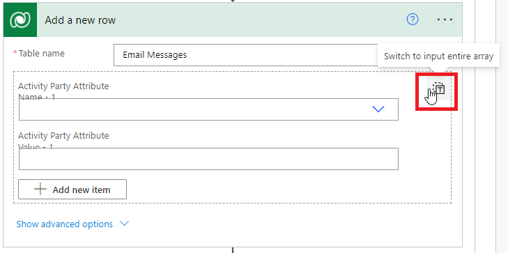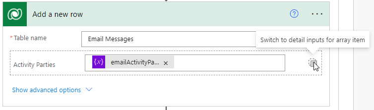 Let’s start by creating the Email record using a Dataverse “Add a new row” action. When you add the “Add a new row” Dataverse action, and select “Email Messages” for the table, you’ll initially see the “Activity Party” attribute in a Detail view. Click the T icon in the top right corner to “Switch to input entire array”. You can always switch back to “detail inputs for array item”. However, using the array variable in our approach allowed us to dynamically the entire the entire Activity Party array in one step, versus having to manually add members to the Email record in multiple update steps. Below you’ll see we populated our variable in the Activity Parties field.