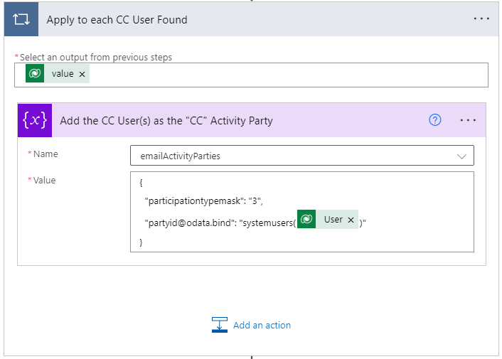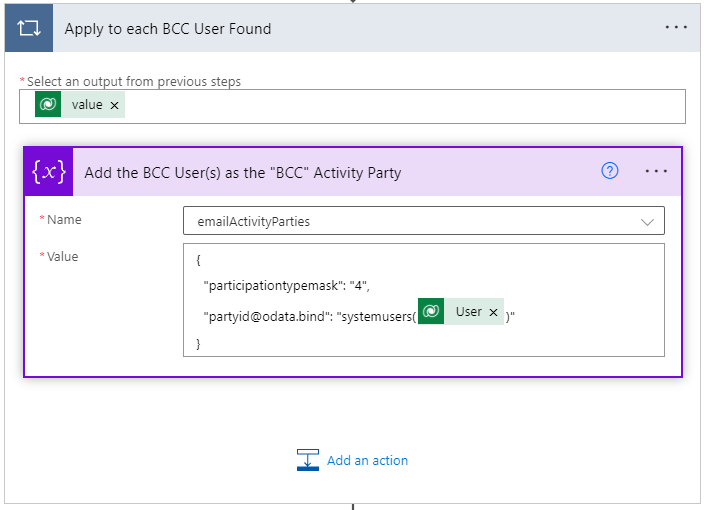The next four steps use similar actions already performed above to 1) Retrieve the CC Users in a List Rows step but slightly different FetchXML, 2) Add the CC Users to the emailActivityParties array variable, 3) Retrieve the BCC Users in a List Rows step but slightly different FetchXML, and 4) Add the BCC Users to the emailActivityParties array variable.