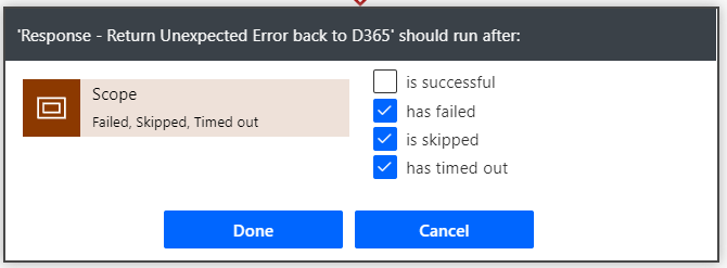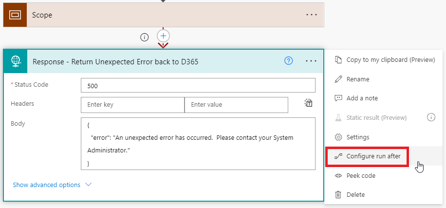 Another good practice is to leverage a Scope action for the majority of the Power Automate processing. You can configure steps after the scope to “Configure run after” and select the options other than “is successful.” This will allow you to catch any unexpected errors that happen in your Power Automate and take action upon them (such as sending an HTTP response back if you created a custom button to call the Power Automate – the custom button can display the error message sent back).