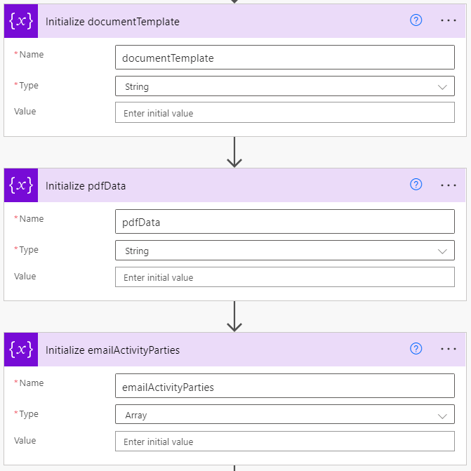 Next, there are 3 variables you need to set up to use in the Power Automate. Two String variables and an Array variable that will end up holding our Activity Parties (From, To, CC, BCC) that we’ll use on our email.