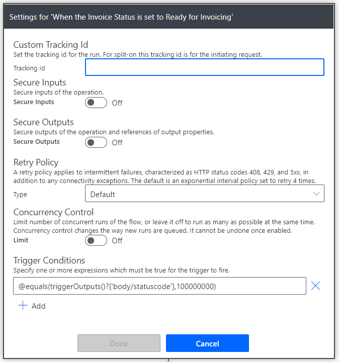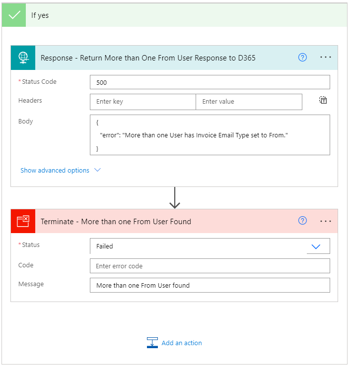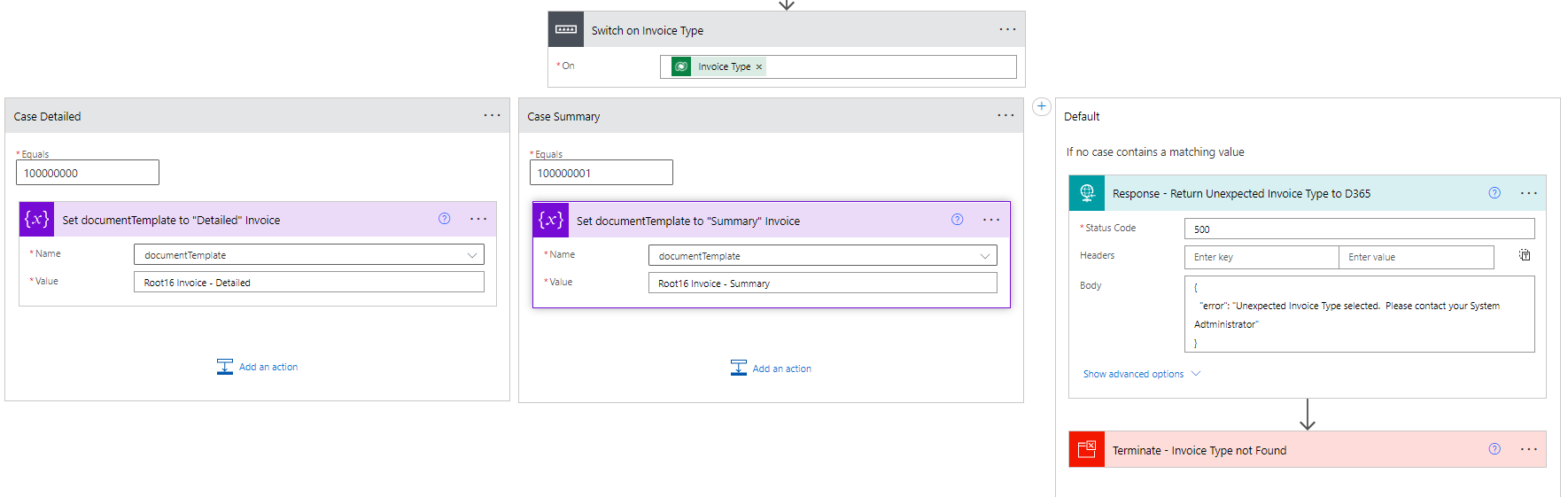 You’ll notice I also have a default action that returns an HTTP Response in case the your data in D365 has a value on Invoice Type that you’re not accounting for. This scenario could be if an administrator updated the Choice field and added a new option, without updating the Power Automate. This response could be surfaced to the end users by adding a little bit of code that initiates the flow, and waits for the response.