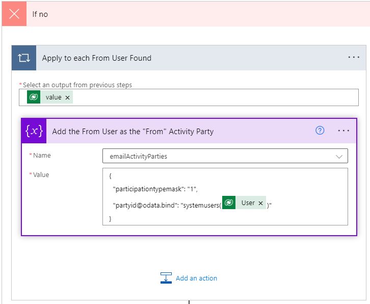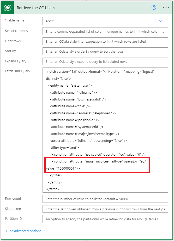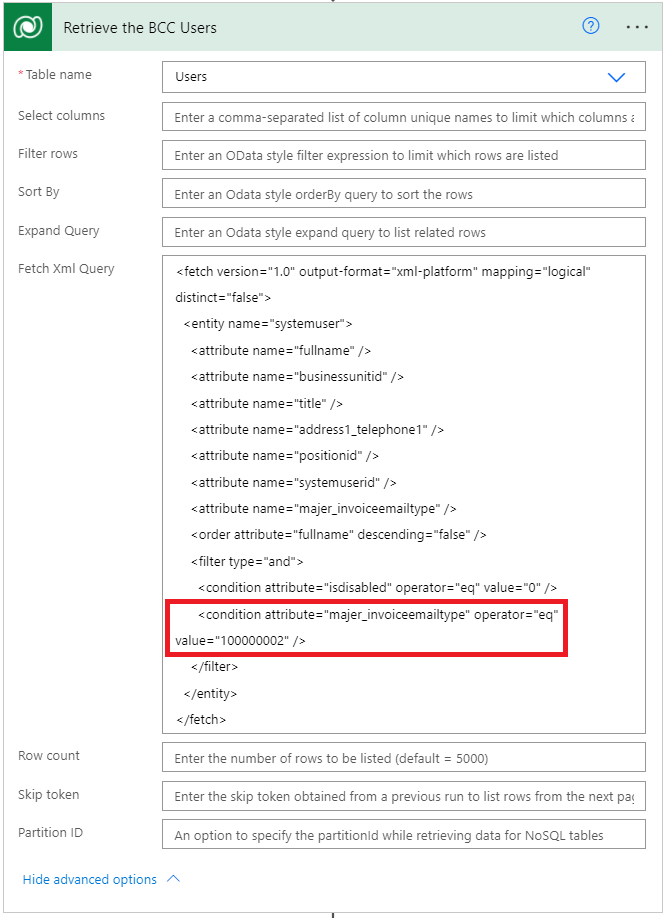 The next set of steps will fill out the rest of the emailActivityParties array (the From, CC, and BCC). An email has to have a From and a To on it, but the CC and BCC are optional. A custom field Invoice Email Type was added to the User entity with values of From, CC, and BCC. This field is used in FetchXML (which can be downloaded by creating your query in Advanced Find, and clicking the Download FetchXML button) in a List Rows action.
