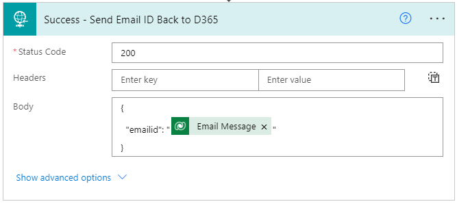 The final (optional) steps are to 1) send a successful response back to D365 should there be custom development waiting for a response, and 2) after the Scope sending an “unexpected error” message back (this action was described above when discussing wrapping the logic in a scope action).