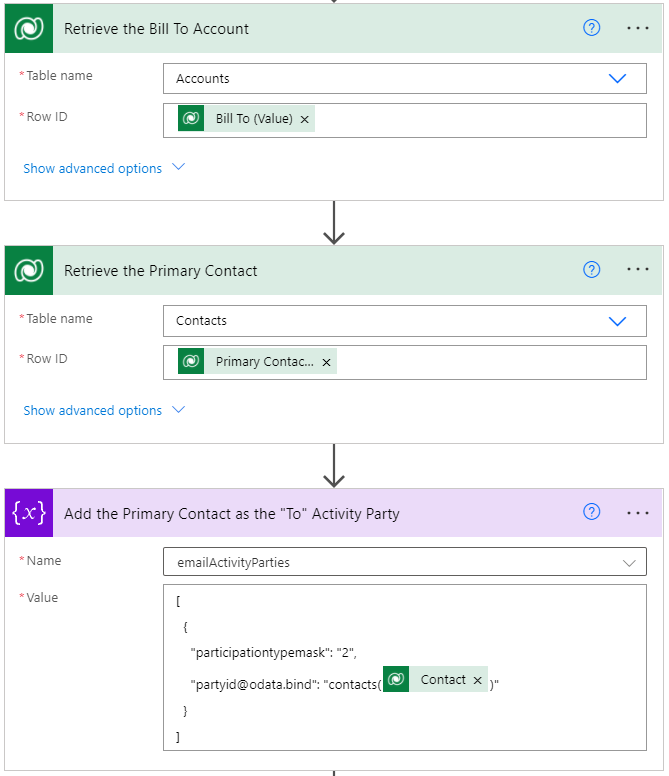 You can optionally add in check conditions in case your Bill To Account and Primary Contact fields are not required and blank. If that’s the case, you’ll get an error when you create your Email later on with this emailActivityParties variable.
