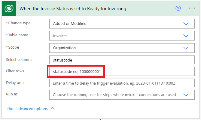 The first thing to note is that when I was creating this solution, I ran into an issue leveraging the “Filter Rows” functionality on the trigger. I wanted my Power Automate to only run when my Invoice is updated to a specific status, so I had entered in the following value for “Filter Rows”, but was receiving a message that there was a problem with my flow’s trigger.