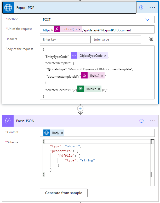 Our next set of actions will generate the actual PDF bits and bytes leveraging another “Invoke an HTTP Request” action followed by another “Parse JSON” action. These actions are similar to the two from above that we used to retrieve the ObjectTypeCode.