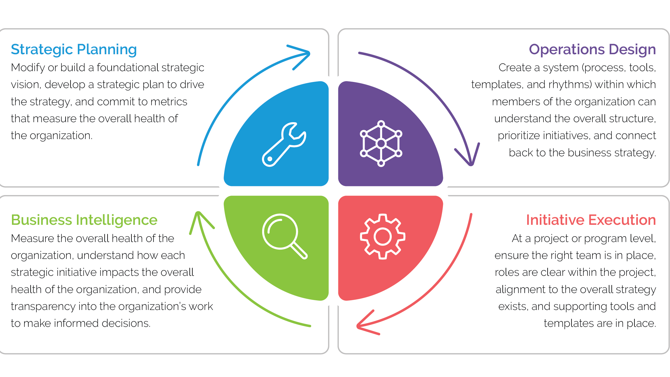 We believe you should approach your operations within a proven framework. When you address all elements of the framework, your organization can fully reach its potential. Our framework demonstrates how strategic planning, operations design, initiative execution, and business intelligence relate to, influence, and depend on each other.