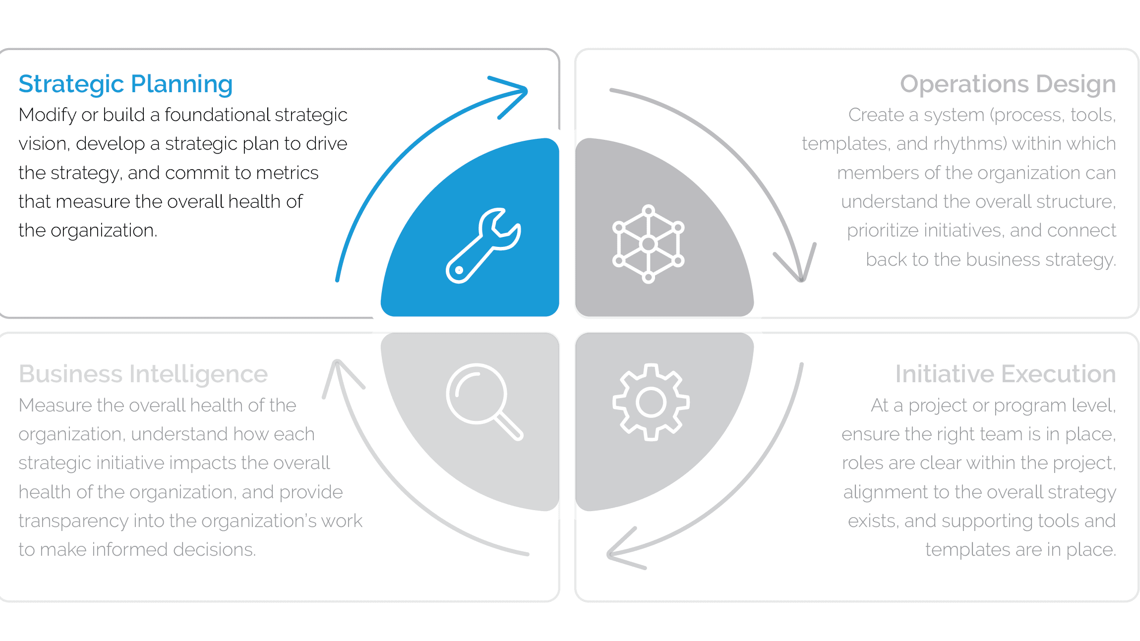 While the business operations framework is a continuous cycle in which each stage informs the next, developing a strategic plan using a strong strategic planning framework is the best place to start.